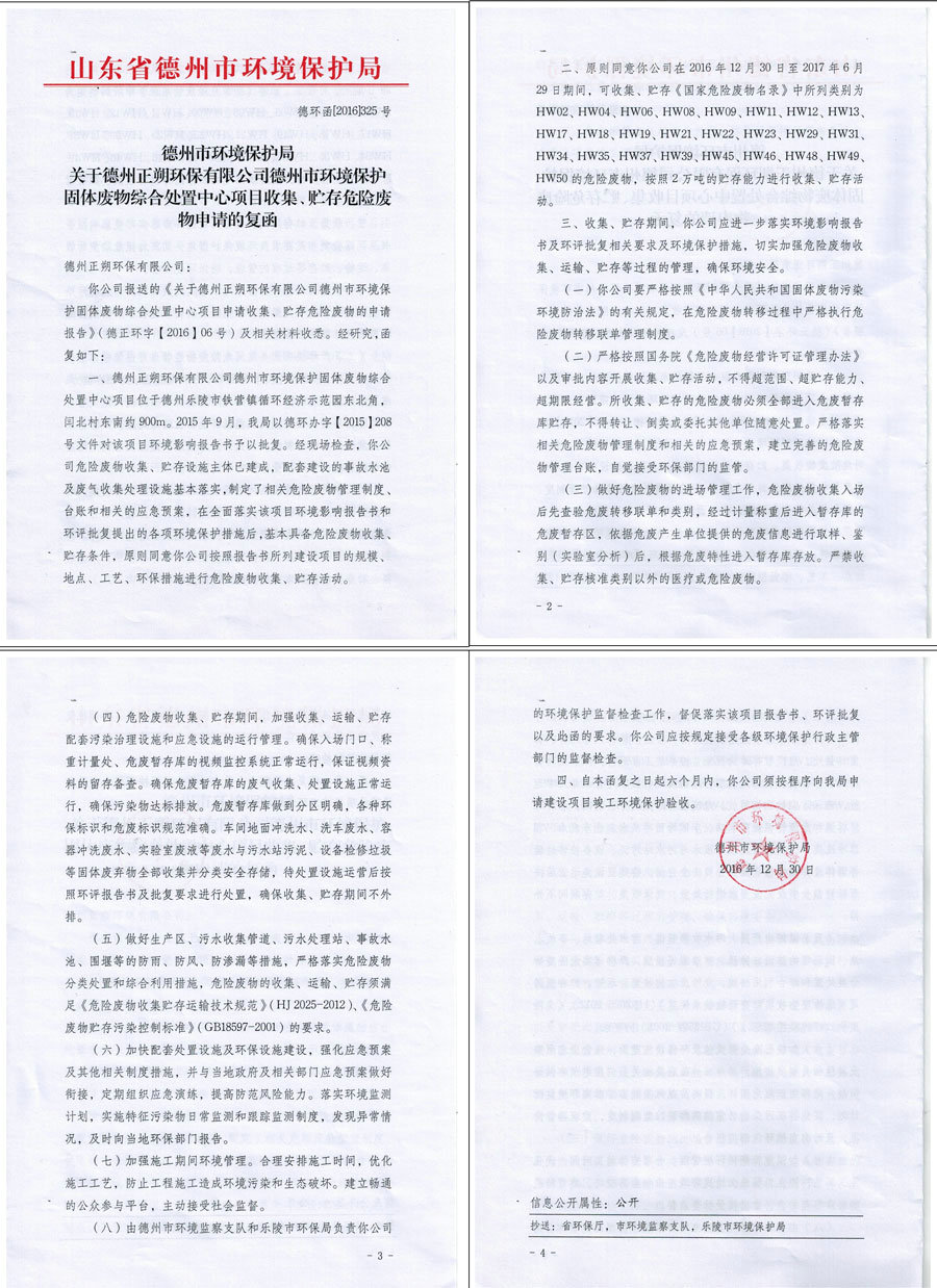 經過一年的緊張施工,目前德州正朔環保有限公司已建設完成危險廢物暫存倉庫,配套設施及應急預案均以齊備,已能滿足收集、貯存條件。經環保局領導及專家於現場驗收後,德州市環境保護局於2016年12月30日對本項目進行批複。