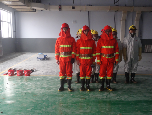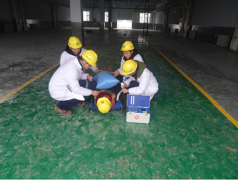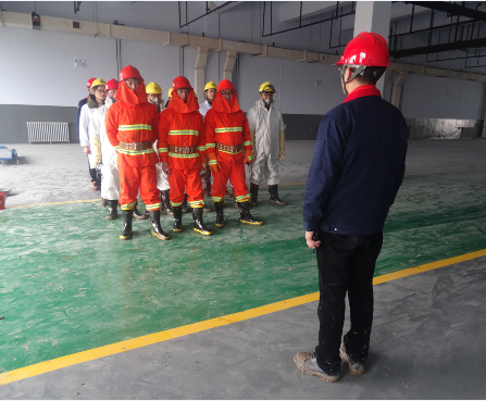 首先由安環部張經理對本次消防安全演練的方案、程序、滅火器材及其使用方法、各專業隊伍的分工等相關細節進行逐一介紹,按照模擬的“場景”:“生產部工作人員正在卸料,搬運過程中,危險廢液不慎流出,導致工作人員中毒倒地,以致引發火災。”