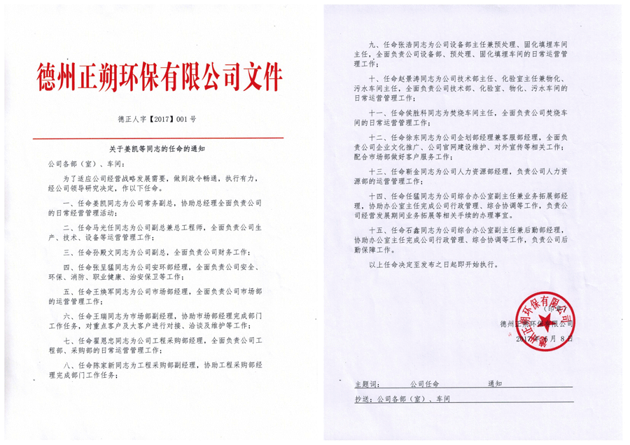 德州正朔環保有限公司作為德州市唯一一家綜合類工業危險廢棄物處置企業,經過層層審核已經具備危險廢物焚燒、填埋、物化、固化等處置能力,伴隨著企業的正式運營,一批批有誌之士懷揣夢想,加入到正朔大家庭。 為了正朔環保的今天與明天,公司高層經過長時間的考察與研究,於今日正式擬定公司組織框架結構,對於有能力、有熱情、有潛力的員工進行了正式任命,對於更多有能力、有激情的一線員工給予肯定。 本次公司擬定了由薑凱同誌為常務副總的一係列任命,其中包括總工程師、財務總監、安環部經理、市場部經理副經理、工程采購部經理副經理、設備部主任、技術部主任、焚燒車間主任、企劃部經理、客服部經理、人力資源部經理、綜合辦公室副主任、業務拓展部經理、後勤部經理在內的15項任命。確立了正朔環保完整的組織管理體係,在公司管理、運營中起到環環相扣、精誠合作的架構,為公司以後順利開展工作,打下了堅實的基礎。 在各級領導的關懷下,我相信正朔的明天會更加美好!
